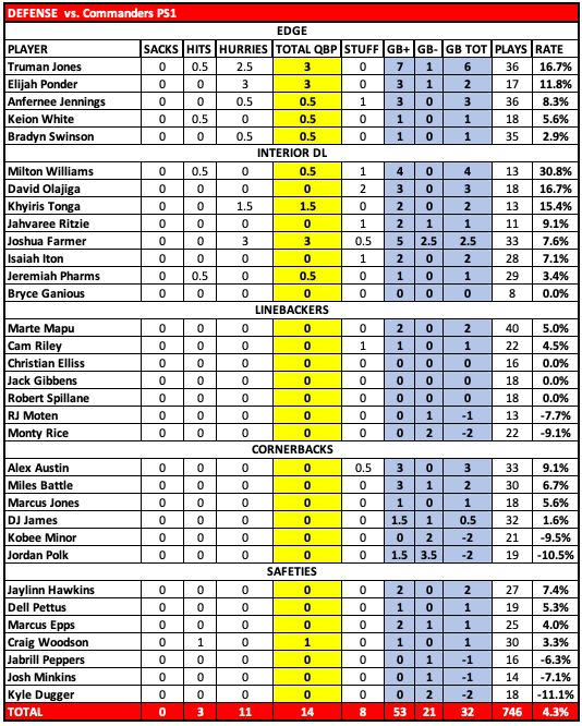 Milton Williams has had a quiet camp, but he showed off his strength and quickness in this game with four impactful plays in just 13 snaps (albeit against backups). The man can split double teams with quickness, and he's a bear on a bull rush. ... Truman Jones got a chance and cashed in with a team-leading seven impactful plays, and he showed up several times on special teams. He can run, and knows how to corner on a pass rush. ... Elijah Ponder had three hurries, including a hold, before he got hurt. ... Khyiris Tonga continues to show he's more than just a run stuffer. He's strong in the pass rush as well. Good find by the scouting staff. ... Anfernee Jennings didn't play until the second half, and then was on the field near the end of the game. He's still a good player. ... Rookie Joshua Famer hasn't has much of a camp due to injury, but he showed his strength and long arms in this game, even if he got bulled on a TD run over LG.