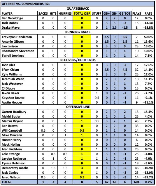 On the other side of the coin, rookie left guard Jared Wilson really struggled in his 14 snaps with five minus plays (and I think most of the blame for the sack/fumble should be placed on Will Campbell and Drake Maye). This surprised me because he's been rock-solid in camp. There was some good work on duo blocks between the two rookies, but there were some technique issues that will need to be cleaned up with Wilson - and he is sort of a novice at this position.