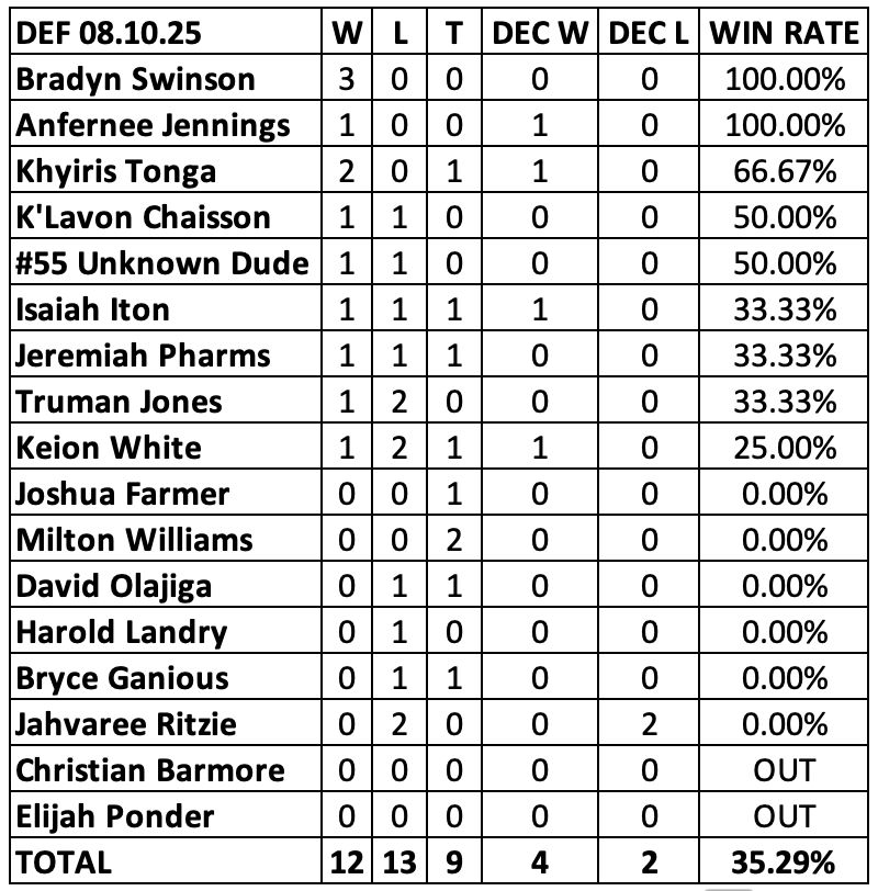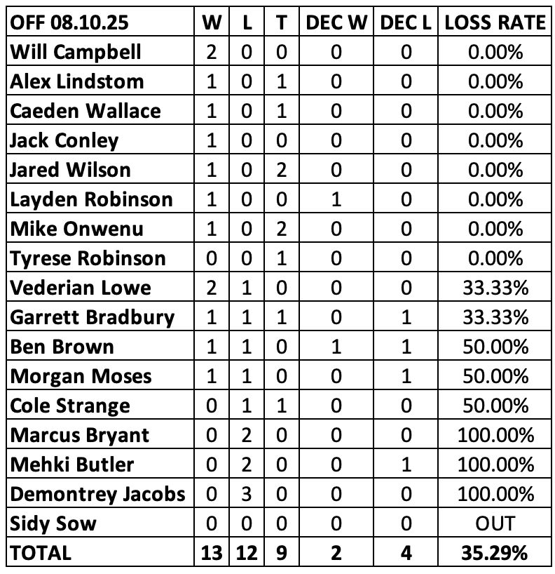 Also: Cole Strange was exclusively at RG. There was no center rotation; Bradbury, after a strong game, was the starting center throughout. Before leaving with an injury, Marcus Bryant was still flipping sides with Demontrey Jacobs. Vederian Lowe took over at LT for Bryant. Caeden Wallace was back at back up LG.