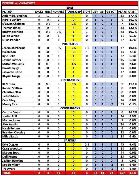 DEs Truman Jones and Bradyn Swinson: Jones posted another four pressures, and Swinson had two pressures and a run stuff.