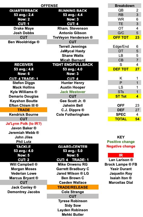 Guard/center: The Patriots only have four (Onwenu, Bradbury, Wilson and Brown) worth having on the roster. Wallace sticks for now, just because he does have talent, but could depart in a waiver claim. I would not be shocked if they kept just four.