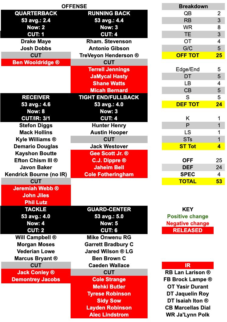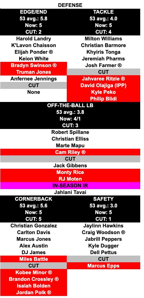 Anfernee Jennings not traded, Bradyn Swinson and Truman Jones released: Shocked the Patriots couldn't find a taker for Jennings, which would have freed up another roster spot at edge. Perhaps that develops as the smoke clears over final cuts, and teams don't get what they want via waivers.