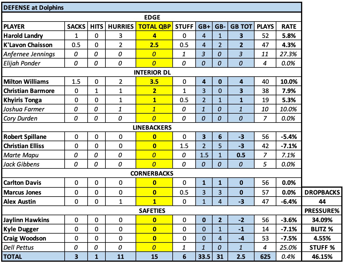 The Patriots, who only blitzed twice in this game, need to find a way to get more four-man pressure before the fourth quarter, but largely, this group was pretty good. They have been outstanding against the run through two games. And they got crucial pressure in the fourth quarter. ... The only minus plays for this group I had were the penalties (K'Lavon Chaisson 2, Harold Landry) and Khyiris Tonga getting shoved out of a gap. ... Everyone ended up making impactful plays, but I have to salute Anfernee Jennings, who had three great plays against the run in just 11 snaps. Not sure Keion White is going to get back in the lineup. ... I did not count two of Milton Williams' "sacks" because Tagovailoa had every opportunity to throw the ball away and it was more about coverage than pressure.