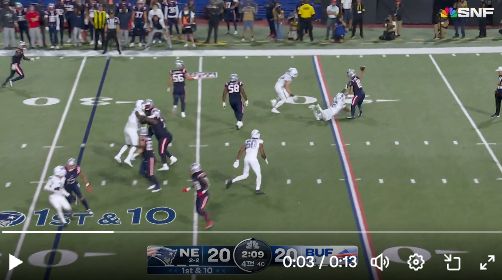 The earlier play I posted, where Maye shrugs off DaQuan Jones, completes a 12-yard pass to Diggs to start the final drive. He could have been dropped for a 10-yard sack, and the Patriots would have been in a world of hurt. Not only did Maye avoid the sack, but he got 12 yards out of it. Amazing.