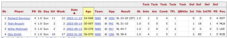 Jones finished with five tackles, three pass breakups and his first career sack. He's the first Patriots defender to register at least three pass breakups and one sacks since Richard Seymour in 2003. This is the rest of the list in team history. Pretty good company.