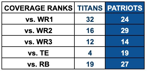 • They can press up on defense. WR Calvin Ridley is hurt, and they have basically nothing else on the outside. The TE is OK, but not a big threat. The Patriots should be able to drop a safety into the box all day long (Titans are 32nd against single-high safety) and are 31st against man coverage. The Patriots should be able to be very aggressive, as long they spy Ward.