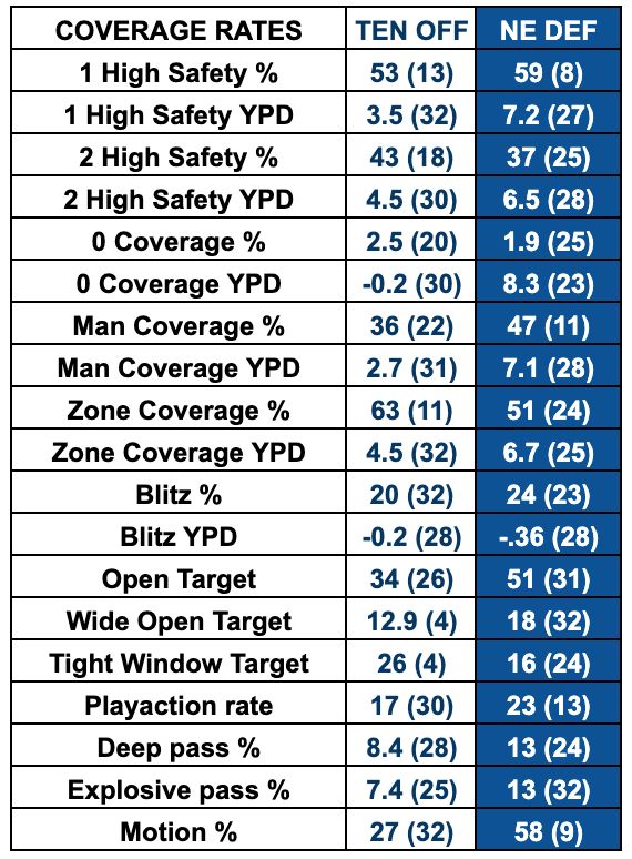• New England could actually run the ball ... maybe. The Titans are 27th in rush DVOA, and have allowed 4.5 yards per rushing attempt and 11 rushing touchdowns — holy cow, 11?! — so maybe this is the week! Maybe it's TreVeyon Henderson SZN!