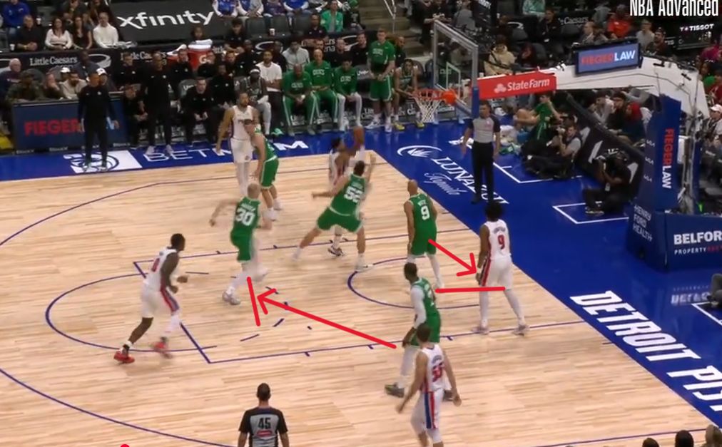 The Celtics are anticipating spin moves on every drive, so when they see a player's back, they are running in for the steal. So when Sam Hauser passes Tobias Harris on to Luka Garza, he's anticipating a spin back to the middle.