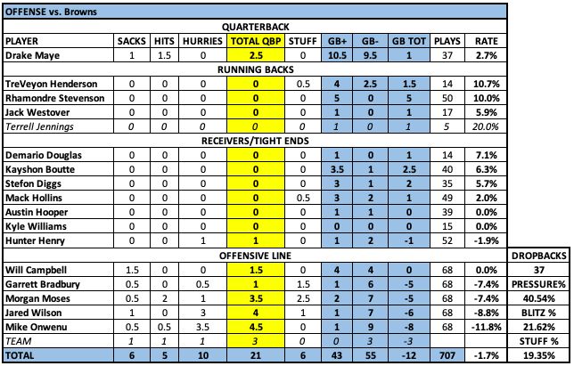I'm running out of superlatives for this group. Kudos to line coach Clint McMillan and outside linebackers coach Matt Smith. The dudes up front were a +30/-2 in this game. I haven't seen this since the Patriots' defense was humming under Bill Belichick. ... The only underwhelming this was that Harold Landry (two hurries, both in the second half) was really quiet. ... Khyiris Tonga was on a heater before his knee injury, including on the first play of the game. ... Milton Williams just rolls along, ho-hum, with a hurry that caused Robert Spillane's interception. ... I think Christian Barmore was motivated by his benching. He balled out after that.