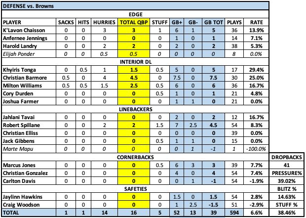 Robert Spillane almost had a showcase game, but I think — I'm not sure — he busted the coverage on the Browns' TD, and he whiffed on a missed tackle that went for 21 yards. ... Jahlani Tavai was very solid, but I can do without Jack Gibbens and invisible Christian Elliss. He played 39 snaps? ... Marte Mapu played one snap, played off coverage by about 10 yards, got picked and never played on defense again.