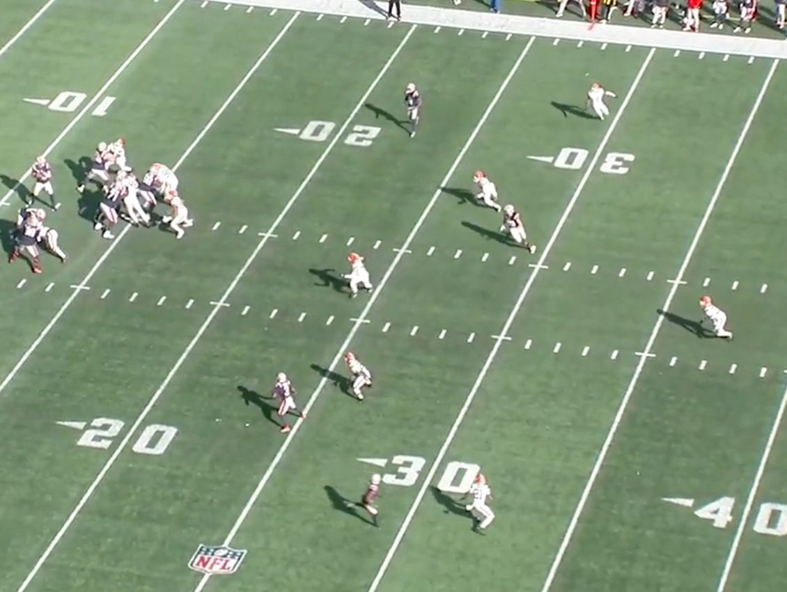 The protection was decent, and he had Demario Douglas/Hunter Henry open against zone coverage. Took a pretty good hit at the end. Mike Owenu shares in this knockdown, being beaten by practice squad DT Sam Kamara.