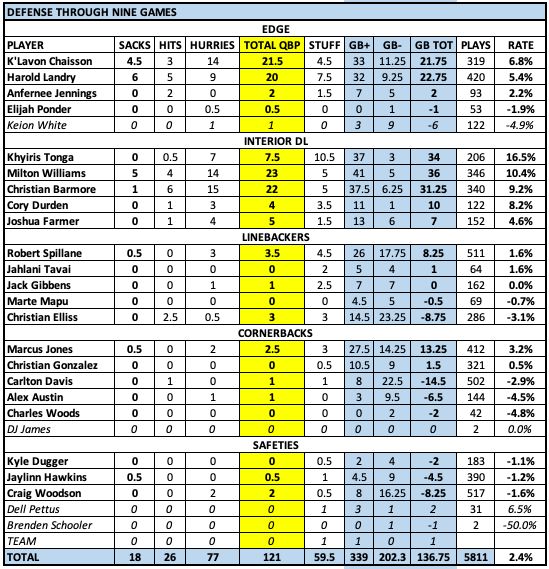 Biggest surprise: Garrett Bradbury allowing the least amount of pressure on the line. I could have gone with Will Campbell's overall play (especially in the run game, his pass protection has been spotty despite a lot of help).