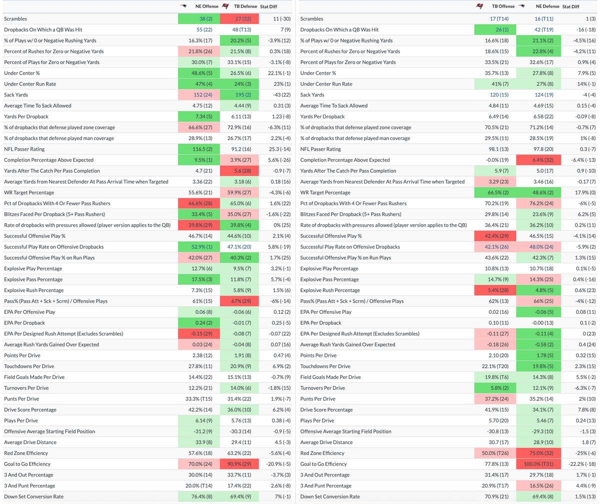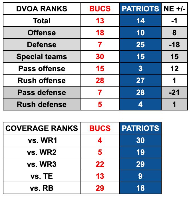 - 12 personnel. The Patriots don't run a ton of formations with two tight ends compared to the rest of the league, but they're pretty good at it (11th in EPA). The Bucs are 25th in EPA against 12 personnel. I think the Bucs prefer to get exotic in nickel as opposed to base. So the more LBs you can get on the field (a weak spot for Tampa - the safeties are good), the more it will force them to simplify things.