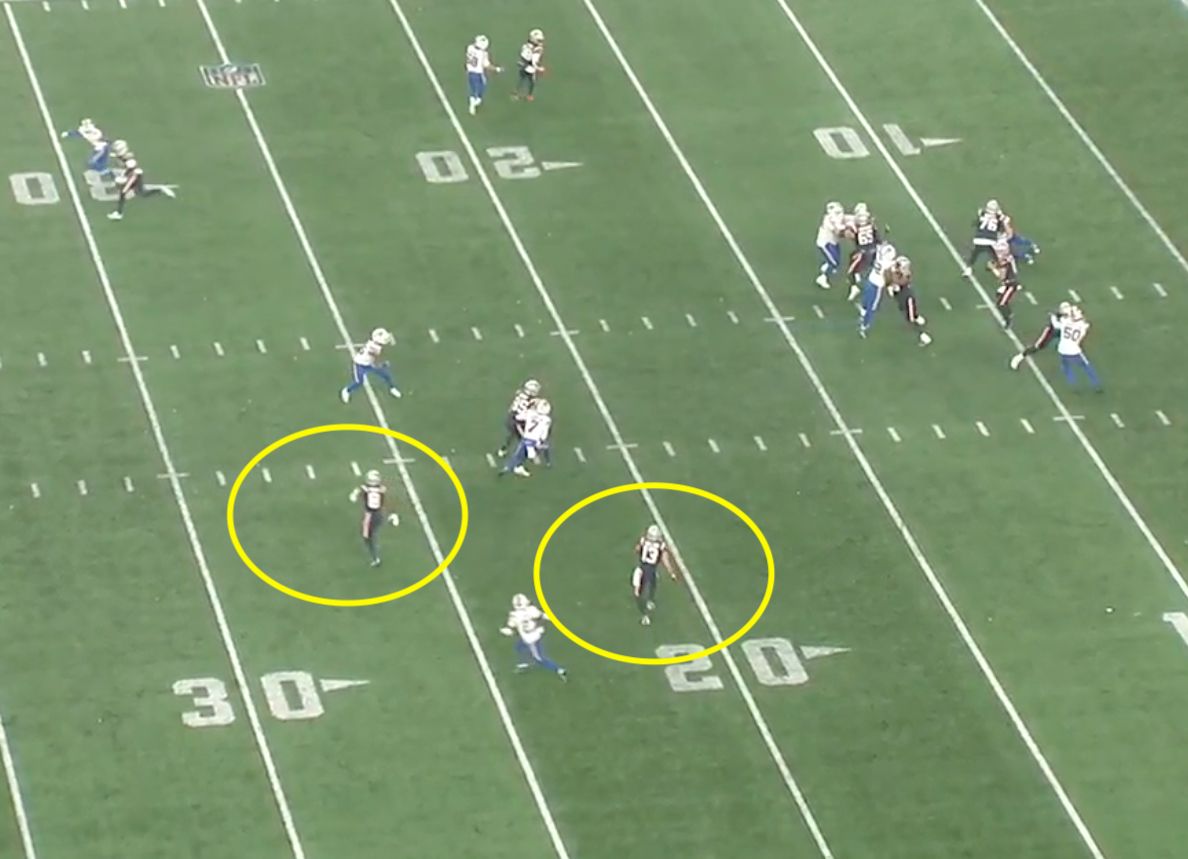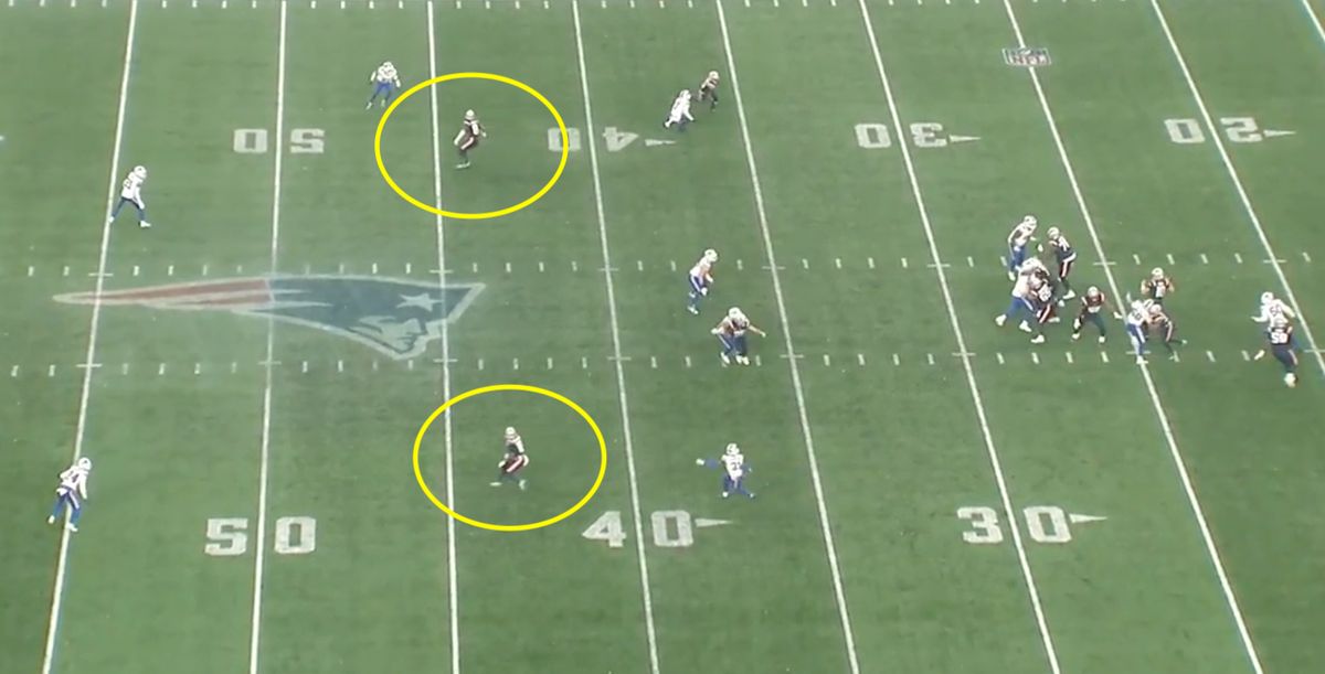 Post-snap look: Cover 6 with a zone exchange (Matt Milano rushes and Joey Bosa drops into coverage).