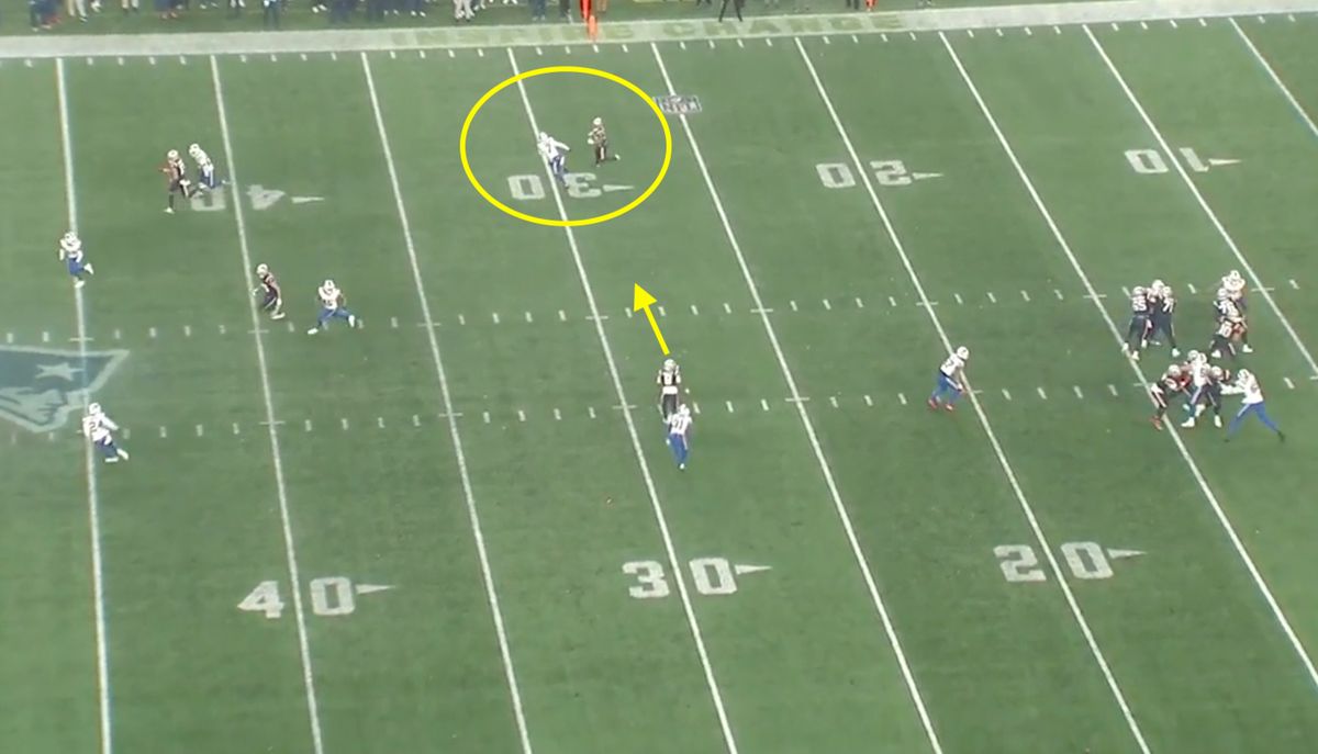 Maye might have been a little confused by this post-snap look, but the real issue is that he leaves the pocket early when he doesn't need to. Even still, Stevenson is right there for a checkdown that would have picked up the first down.