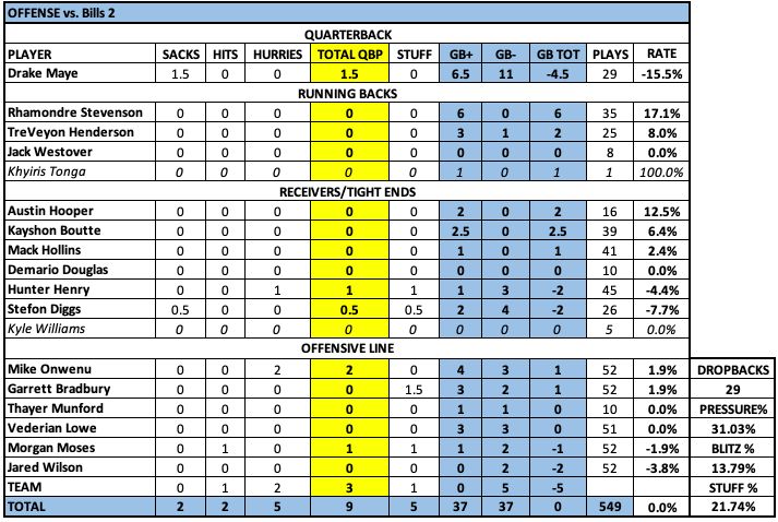 I also think McDaniels defaults to putting the game in the hands of the quarterback. Is he ready for that? Well, McDaniels did that in the Week 5 meeting with the Bills, and Maye delivered by lifting the team to victory. So I can understand McDaniels doing it again on Sunday, but it did not pay off in the second half as Maye had his worst stretch of football in his career. In the first half, I graded Maye as having 5.5 plus plays (one elite throw to Kayshon Boutte to open the game), and just one minus play (the 3rd and 1 errant throw to Mack Hollins). In the second half, Maye had one plus play (the block on TreVeyon Henderson's touchdown), and 10 minus plays — five decisions, two throws/decisions, three throws.