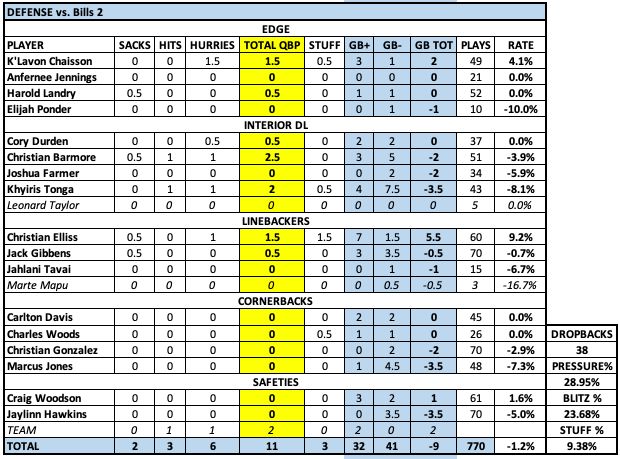 Got dominated in the run game and barely got any pressure against Allen, especially in the second half. ... Want to know why the Patriots couldn't get off the field? They didn't wall up against the run — all the tackles and edges were on different levels as the Bills' line dominated the trenches — and the edges couldn't beat LT Dion Dawkins and RT Spencer Brown. Those guys are good, but K'Lavon Chaisson and, especially, Harold Landry weren't much better after the bye week. .... Khyiris Tonga and Christian Barmore were awful against the run in the second half. They got owned.