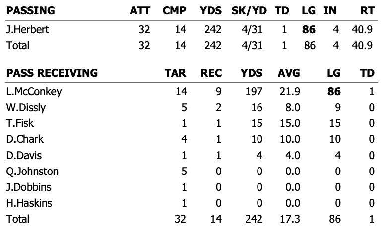 Backs JK Dobbins and Gus Edwards rushed 16 times for 48 yards (2.8 ypc). This is what Herbert had for weaponry against that defense:
