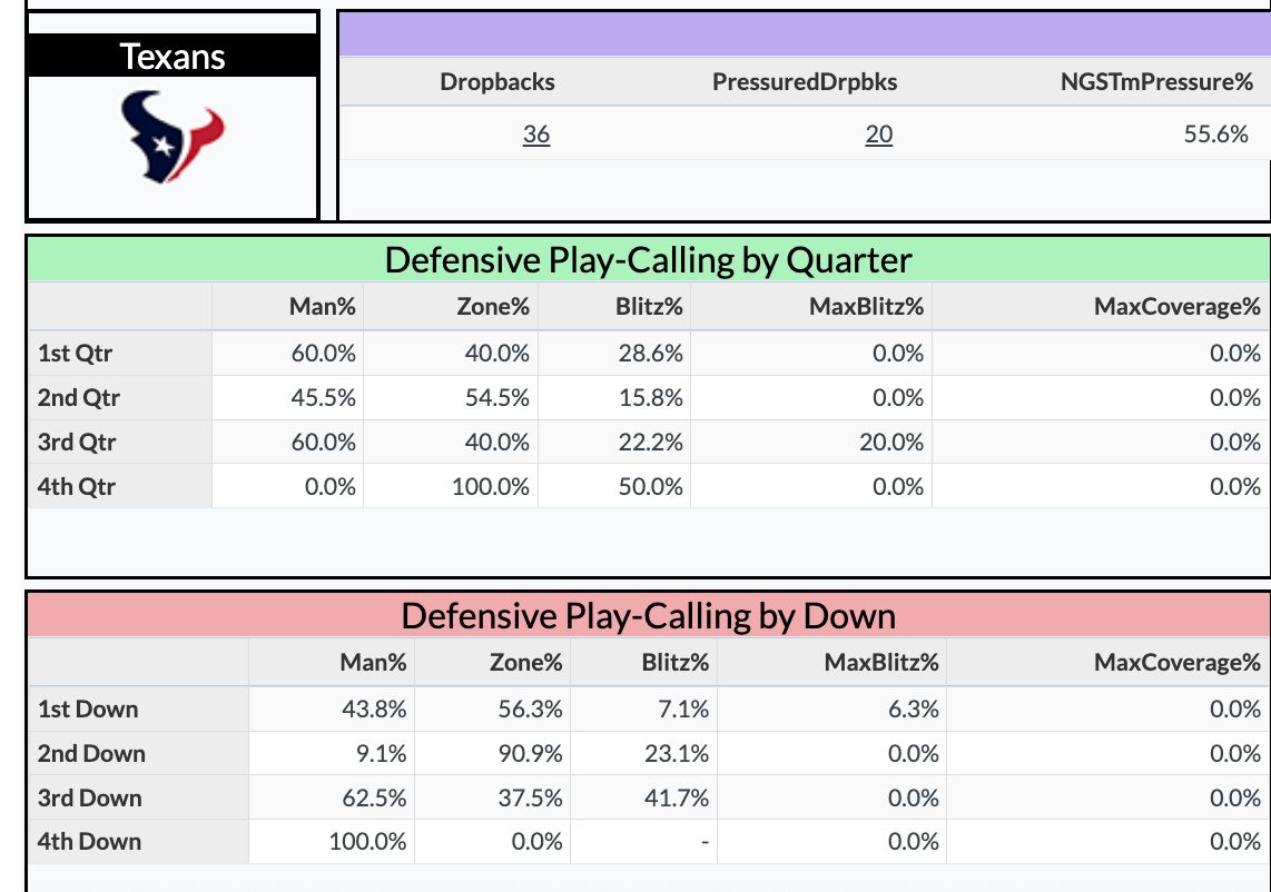 Let me also point out that Houston had a 55.6% pressure rate, an absurd number where most quarterbacks have a losing effort. The time to sack allowed was just 3.64 seconds — the Chargers' season average was 4.66. And the Texans thought so little of the Chargers' "weapons" that they played man nearly 60% of the time until the game was over in the fourth quarter. Outside of McConkey, they were completely snuffed out.