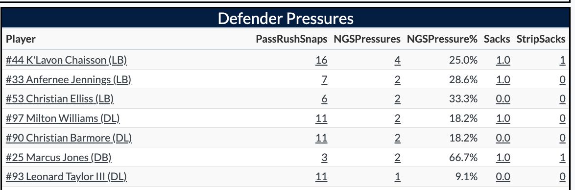 The Patriots blitzed and got pressure on Herbert 39% in the first half, with most of it coming late. This is where the pressure came from in the first half: