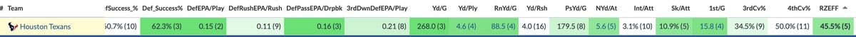 But DVOA has Houston 2nd against the pass and the run, and it played the third-toughest defensive and team schedule this season (Some opponents: Rams, Jaguars 2x, Ravens, Seahawks, 49ers, Broncos, Bills, Colts with Daniel Jones, Chiefs, Chargers - 7-4 in those games).