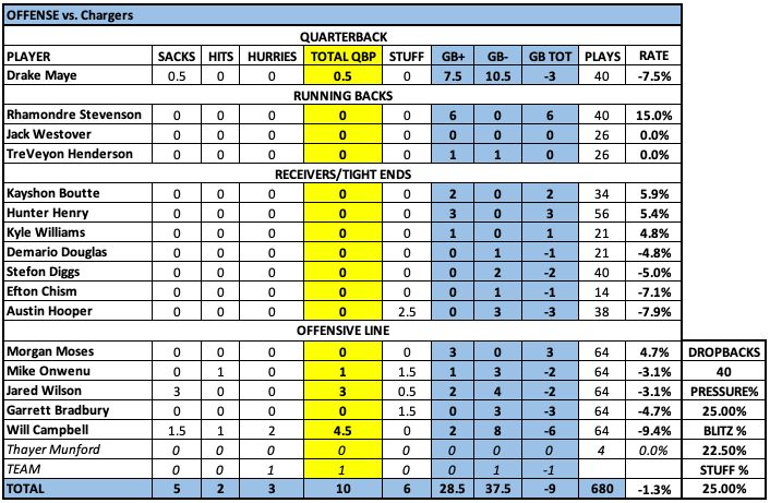 Henry and Boutte led the way, but DeMario Douglas (drop), Stefon Diggs (drop, route), and Austin Hooper (2.5 stuffed runs) were disappointments. The Chargers definitely tried to take Diggs away. The one time Maye and Diggs were not on the same page, I side with Maye. Diggs needed to continue his cross against man coverage.