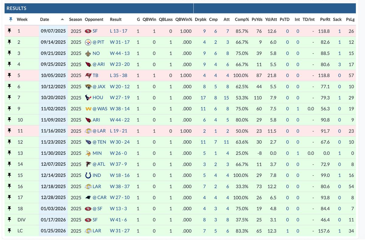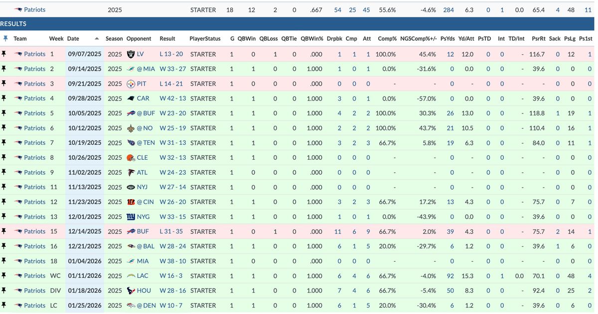 Some of you may be saying, "The Bills game? The Patriots scored 31 points!" Yes, but if you remember, the Patriots scored just 7 points in the second half as the Bills came back to win, scored four rushing TDs (two big ones by TreVeyon Henderson, two by Maye), Maye's rating was 62.8 (lowest of the regular season by far). Also, I'll add that was my second-lowest graded game of the season, and the heavy Cover 6 games, minus the Ravens, were four of my eight lowest-graded Maye games.
