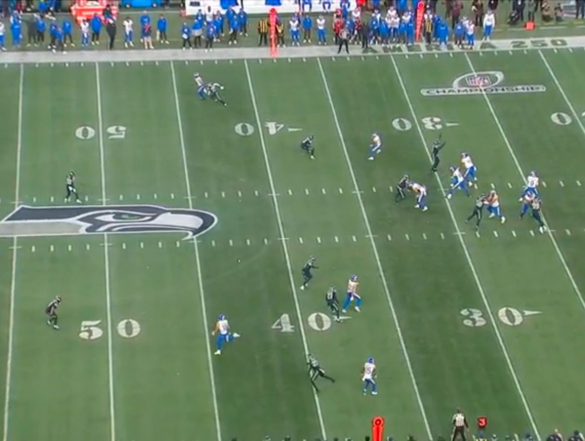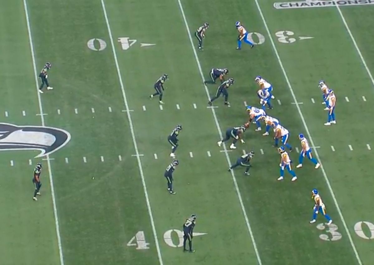 I also checked out some of the plays tagged as Cover 6 for the Seahawks against the Rams, and it checks out. But I will add that the Seahawks have their own flavor, where the lone cornerback actually plays press man. You'll see it in the following pictures at the top of the screen, with cornerback 29 Josh Jobe lined up with Davante Adams (it's Jobe because 27 Riq Woolen is the other boundary, and 21 Devon Witherspoon is matching against Puka Nacua in the slot, or at least attempting to; Patriots could get this Witherspoon on Diggs).