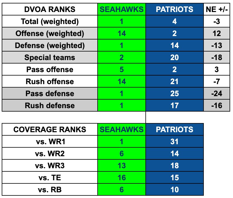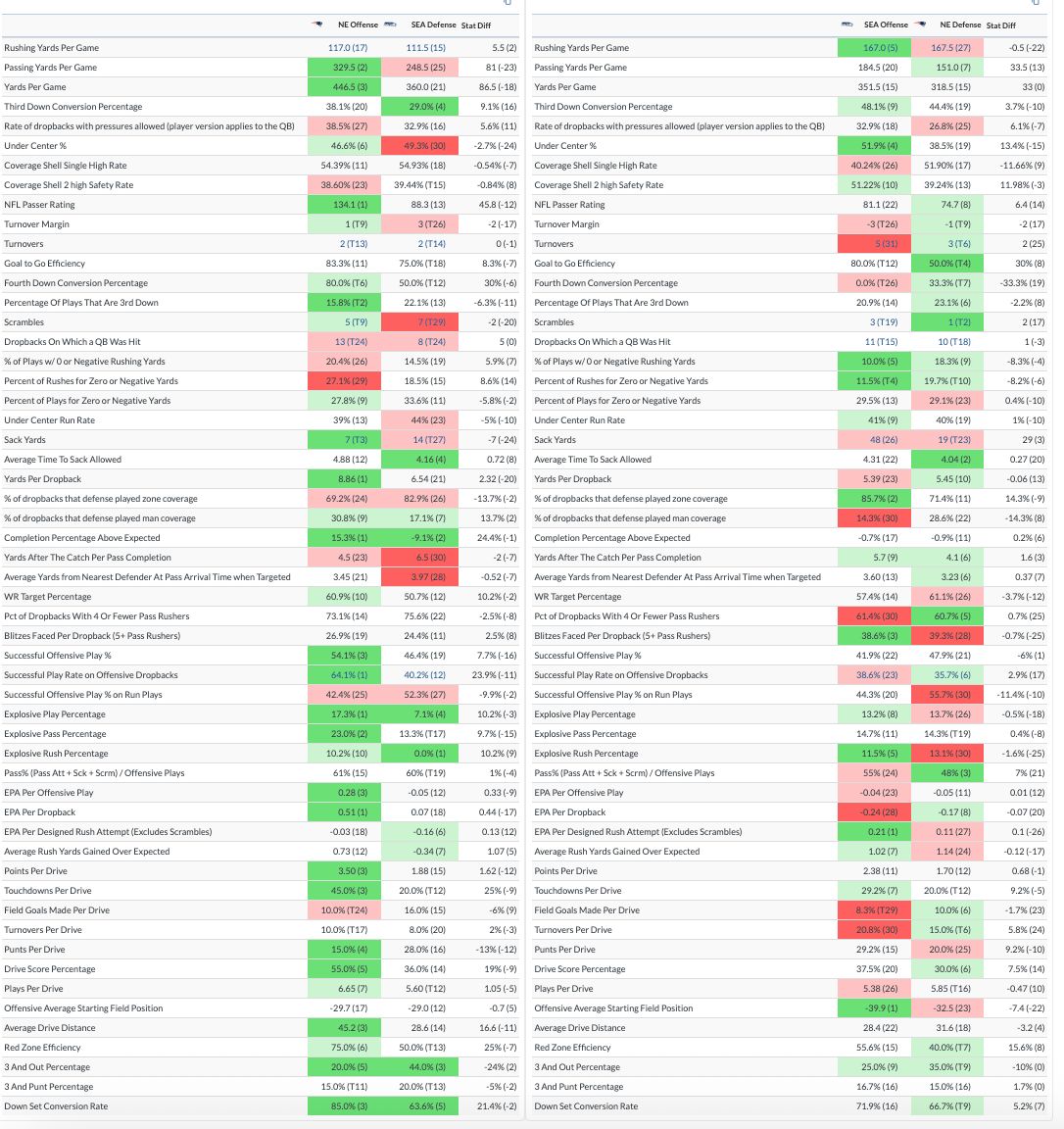 Seattle puts the special in special teams: Rasheed Shaheed is one of the league's most dangerous punt and kick returners, while the Patriots are 23rd in EPA per kickoff and 30th in EPA per punt this season. Seahawks punter Michael Dickson and kicker Jason Meyers both have the edge over Bryce Baringer and Andy Borregales. In a game expected to be tight, special teams could swing it with a big play.