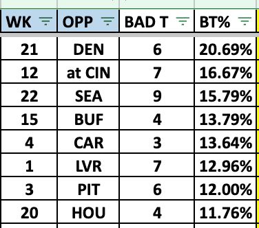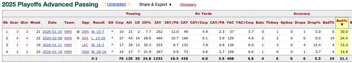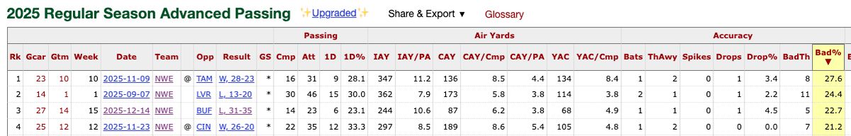 Played terrific football wire to wire as he quickly adapted to Josh McDaniels' system - probably faster than anyone thought possible. His athletic ability kept a lot of plays alive, his deep ball accuracy was off the charts, and he mostly played within himself. An almost unbeatable game for the Patriots was Maye not turning the ball over, and him making 3-5 elite plays a game. Now, was he truly as good as his stats (led league with 72% completions, 113.5 passer rating) showed during the season? Probably not. Some of that was inflated because of a 32nd-ranked offensive schedule - he was probably more like a 67% passer, as evidenced by his 51% completions in the postseason. Given Maye's much-talked-about Super Bowl stinker — some used his performance as proof that Maye was injured (he was not) because he didn't show that inaccuracy during the season — I went back and created a new stat: bad throw percentage. Actually, Pro Football Reference already has that, but I had never done my own. Here is PRF for Maye: