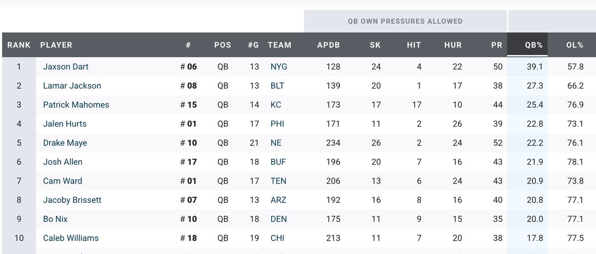 Needed areas of improvement: his footwork when he's not able to be decisive on first read, which is where most of his accuracy issues pop up; taking care of the football, especially in regard to fumbles; and avoiding pressure/sacks. Maye was responsible for 49.5 QB pressures, and 23.5 sacks this past season. Only Will Campbell (59) was responsible for more. A lot of this is just part of the athletic QB experience, as PFF has Maye fifth in the league in QB pressure percentage (22.2%), in the same company of similar QBs that you would expect. I'd like to see some improvement in this area, with a goal of getting to around Caleb Williams' territory (a very surprising 17.8%).