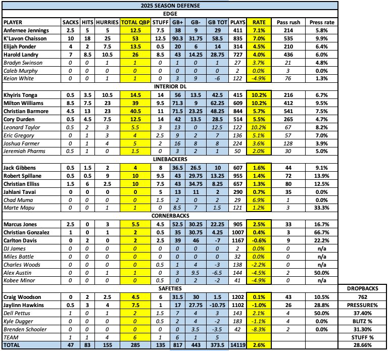 Defense (last two columns are pass rushes, and pressure rate based on their total QB pressures):