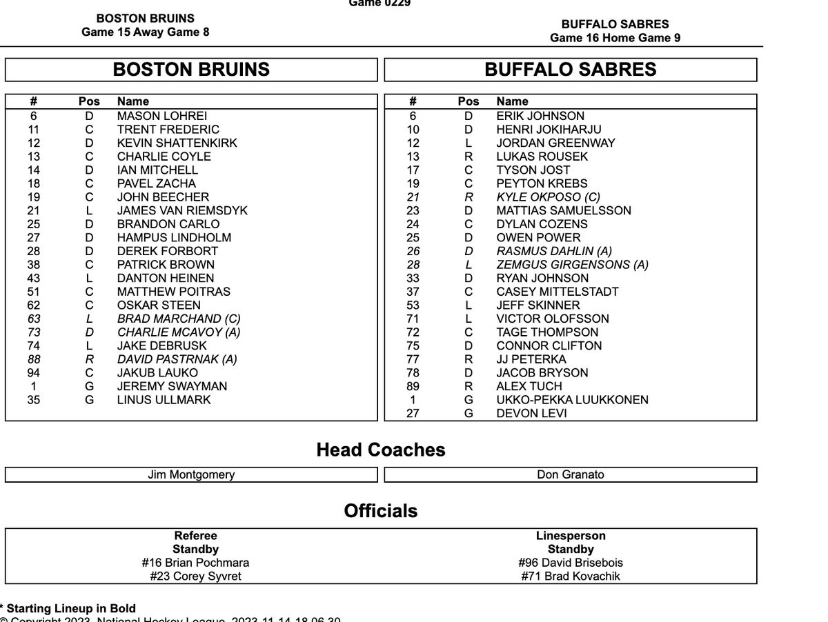 Jim Montgomery announced some lineup changes for tonight which includes: Kevin Shattenkirk replacing Ian Mitchell on the third line with Derek Forbort, Danton Heinen and Jake DeBrusk switching sides on the third line, with Matt Poitras in the center and Linus Ullmark will be starting in net.