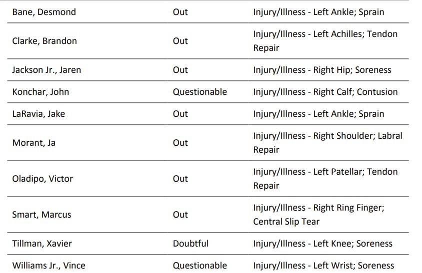 Memphis: So many that I’m giving you a screenshot of the report instead of typing it all out. It doesn’t even include Ziaire Wiliams, who is out with an injured hand but he didn’t fit on this page.