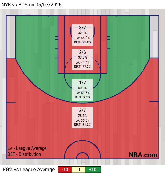 Very simply put, make one more shot in each of those red zones and that's seven more points for the Celtics. They could have been up 20 close to the end of the first which would have put pressure on the Knicks. I don't think the Knicks can handle that pressure, especially if the result is 3-pointers.