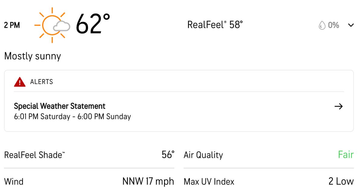 AccuWeather forecast: Nice but a little on the windy side.