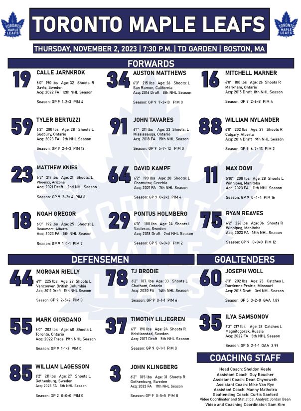 The Bruins will face off against the Toronto Maple Leafs at 7:30 p.m. in an Original Six matchup. Boston enters tonight with an 8-0-1 record on the season, extending their season-opening point streak to nine games, a new franchise record. The previous record was held by the 1937-38 squad.
