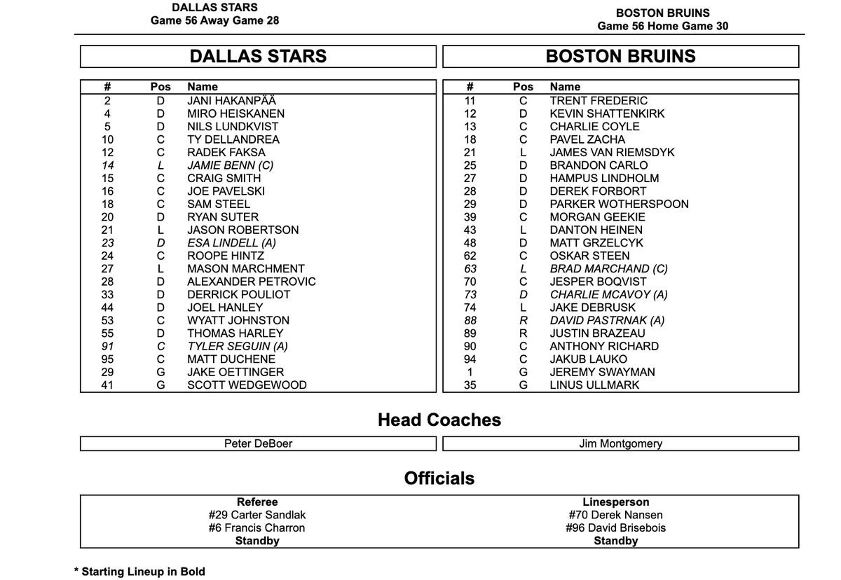 The task doesn't get any easier today as they face a Dallas squad that leads the Central Division with 75 points, which is also tied with Boston for the third points points in the league. The Stars enter today coming off a 4-3 overtime loss to Edmonton that ended a three-game winning streak. Matt Duchene and Jason Robertson are tied for the team lead in points at 55. Roope Hintz paces Dallas with 23 goals on the season. The Stars also have the top offense in the NHL as they score 3.75 goals per game. The Bruins are going to need to show urgency and toughness right out of the gate if they want to keep up with one of the best teams in the NHL.